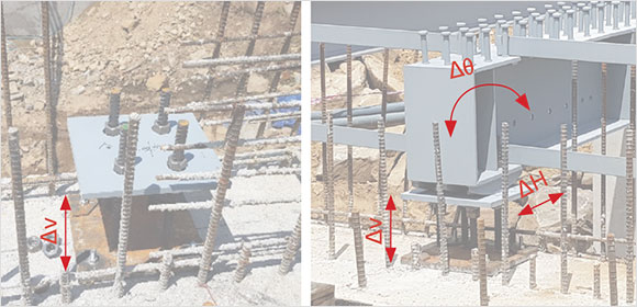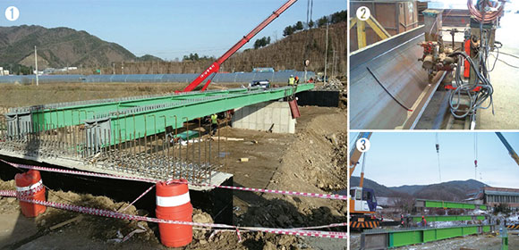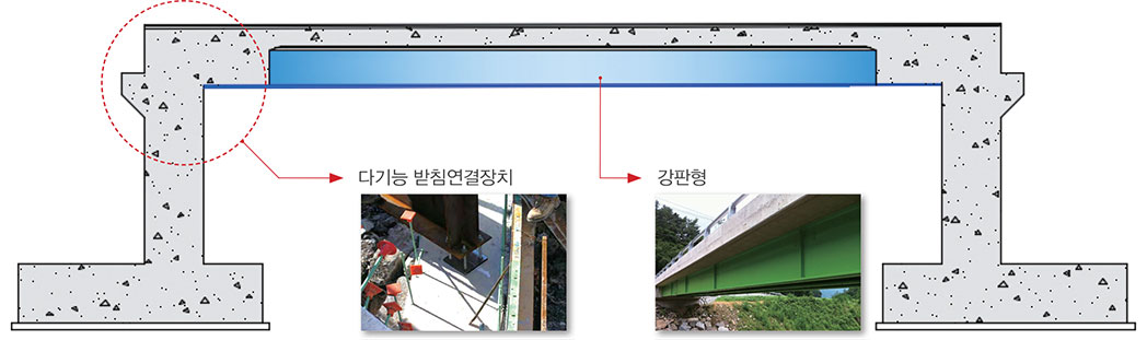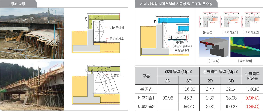 시공중 강거더의 설치높이 조절 및 변위수용과 전도방지가 가능하도록 한 다기능 받침연결장치를 적용하고, 균열안전성과 교량 하부공간 확보에 유리한 거더 매립형 사각헌치를 적용한 강합성 라멘교 교량공법