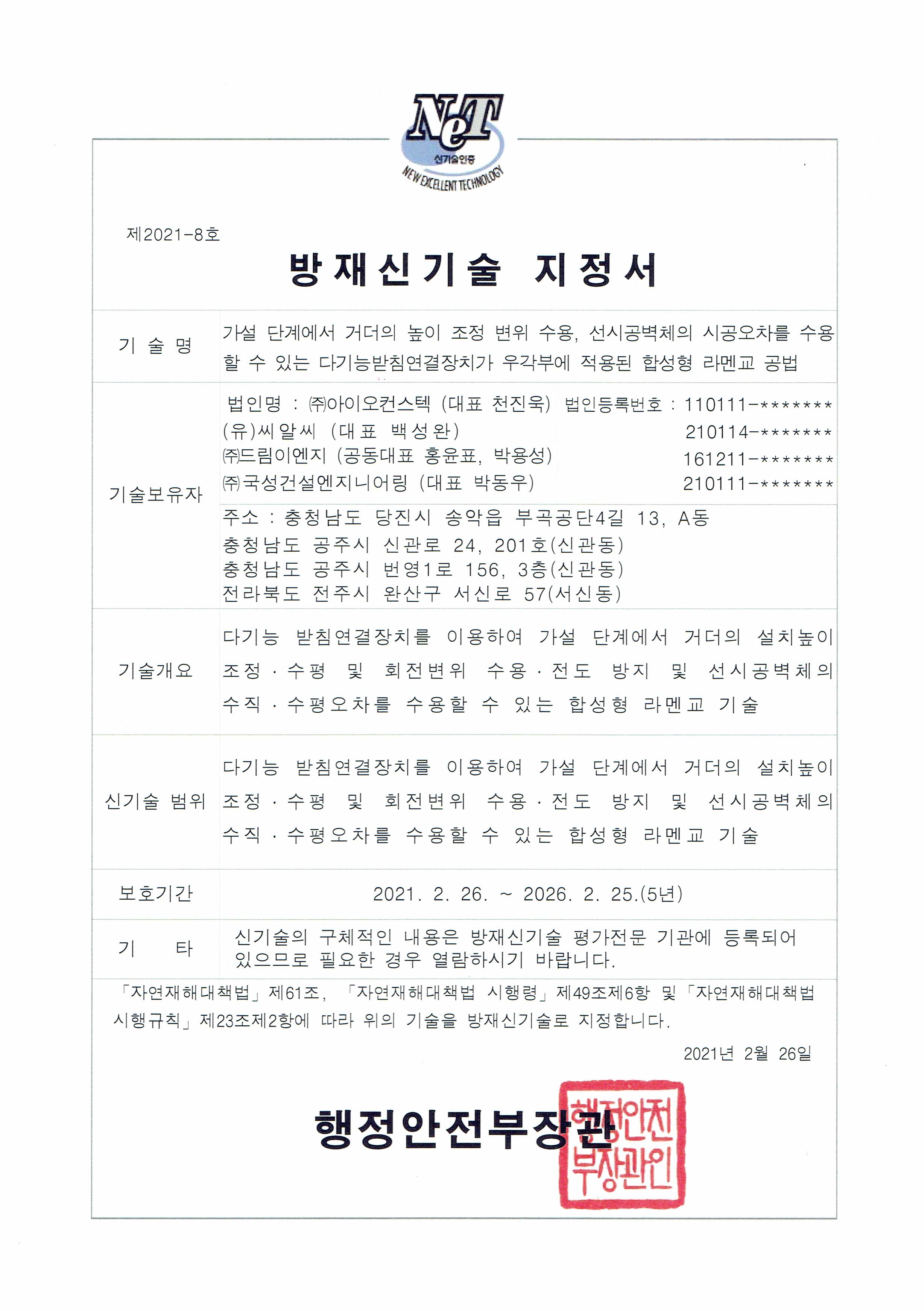 가설 단계에서 거더의 높이 조정 변위 수용, 선시공벽체의 시공오차를 수용 할 수 있는 다기능받침연결장치가 우각부에 적용된 합성형 라멘교 공법